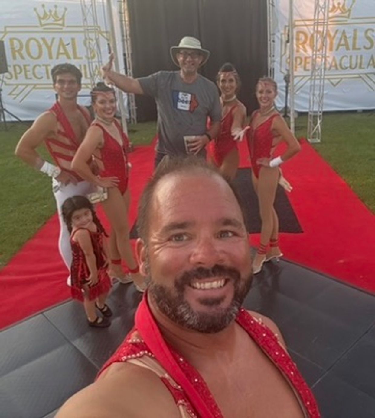 Hey, I finally joined the circus! This guy talked me into it. He might be a world class gymnast with the Cirque-du-Suplex team, but me? Oh yeah, saw me coming from the beer tent. Yes, I am the new net tester for the team! I climb all the way to the top and flop all the way down on to the net to see if it is tight enough for the smaller team members. A little light on the details of what happened to the last guy in this role on the team but our leader sees great confidence in me and my innate skills and that is all that matters.